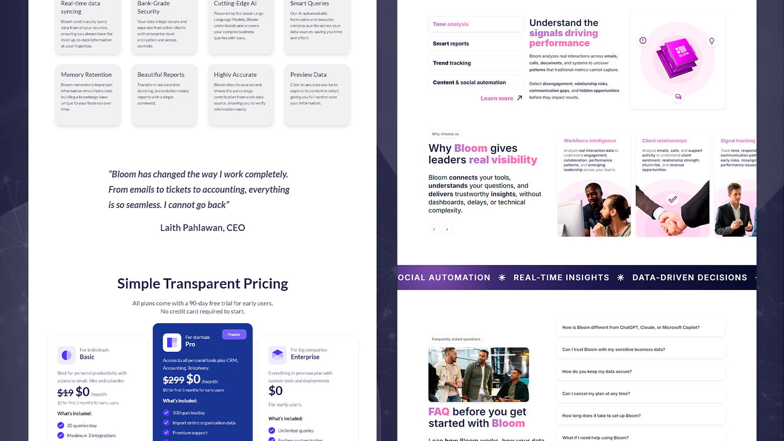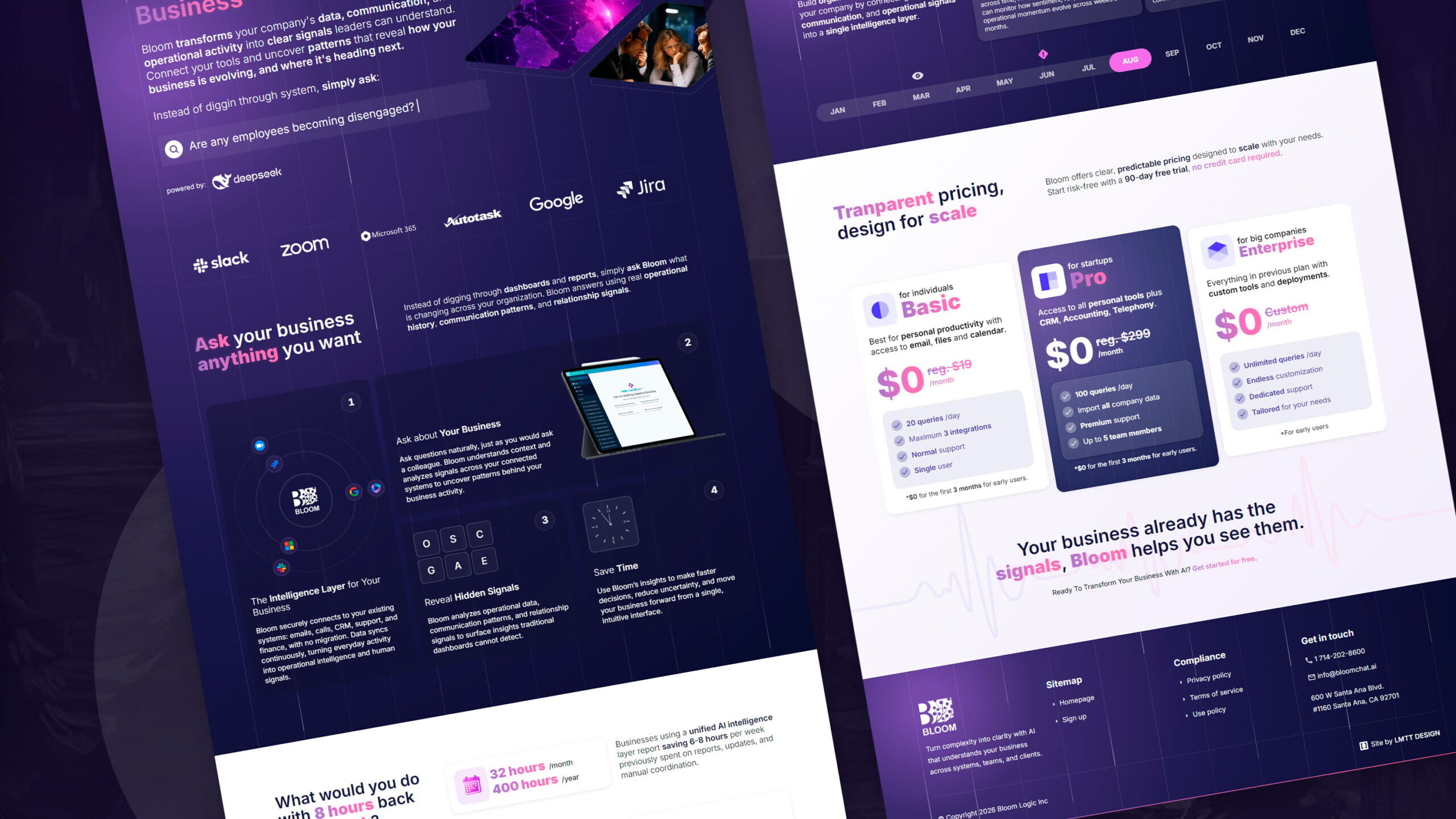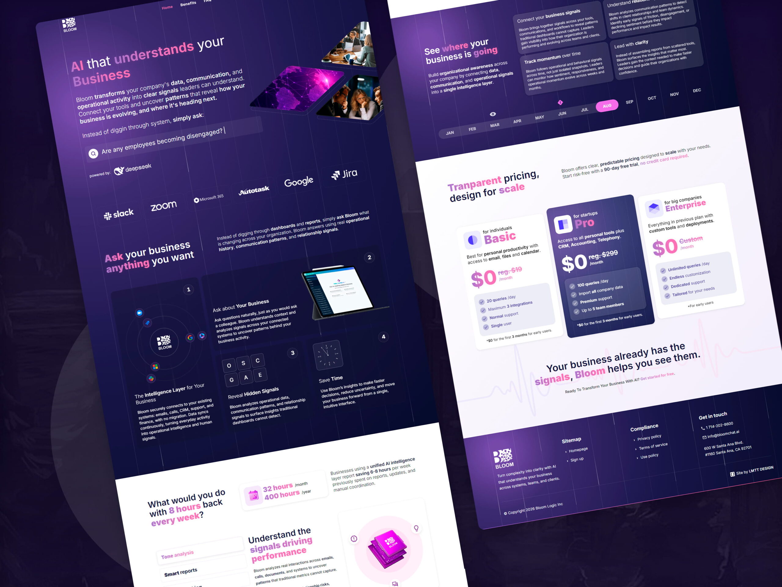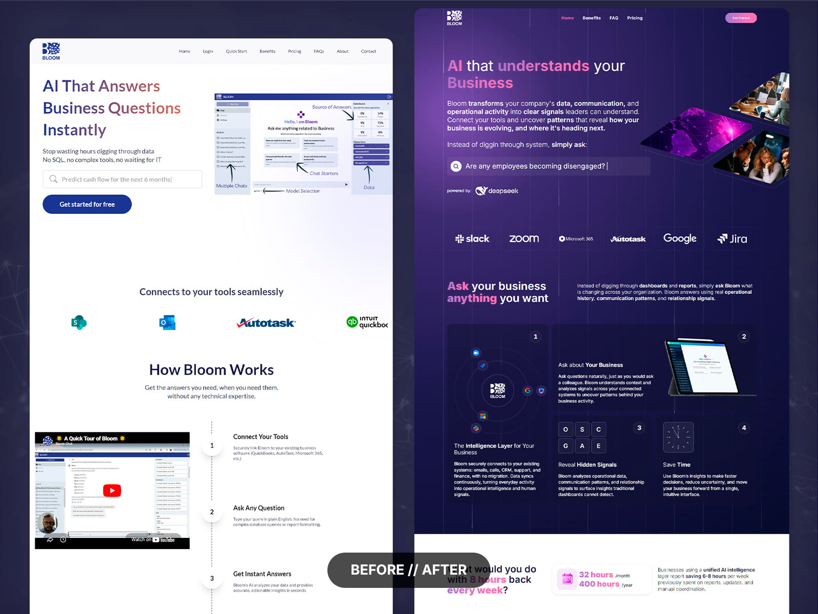 A Bloom Chat AI é uma plataforma de inteligência artificial criada para transformar conversas, interações com clientes e dados operacionais em insights acionáveis para empresas. O desafio do projeto era comunicar um produto complexo de forma clara e intuitiva, sem abrir mão de uma apresentação premium e altamente visual. O site precisava transmitir inovação, sofisticação e confiança, combinando storytelling, design SaaS moderno e uma experiência interativa que reforçasse o posicionamento da marca como “The Intelligence Layer for Your Business”.