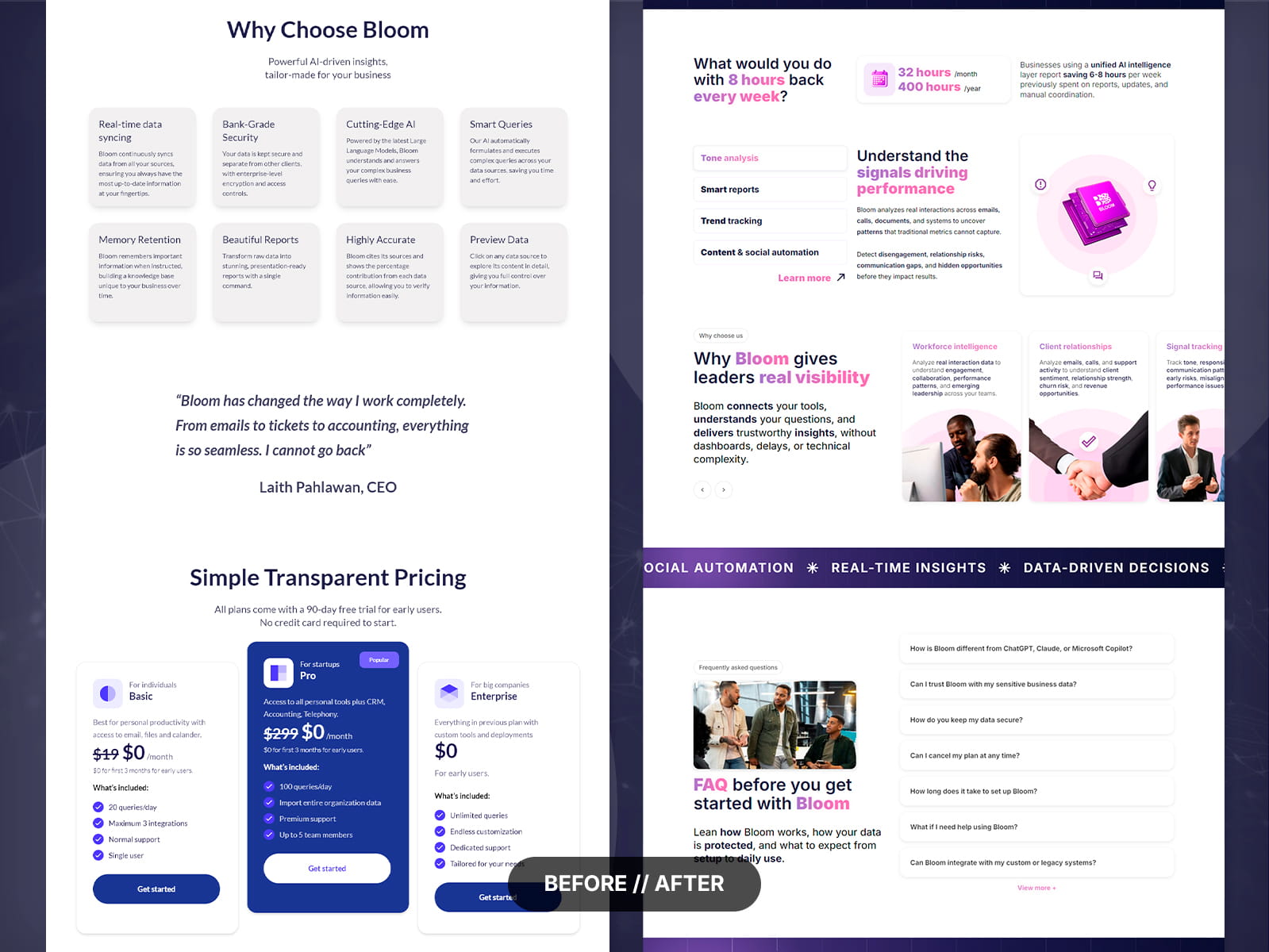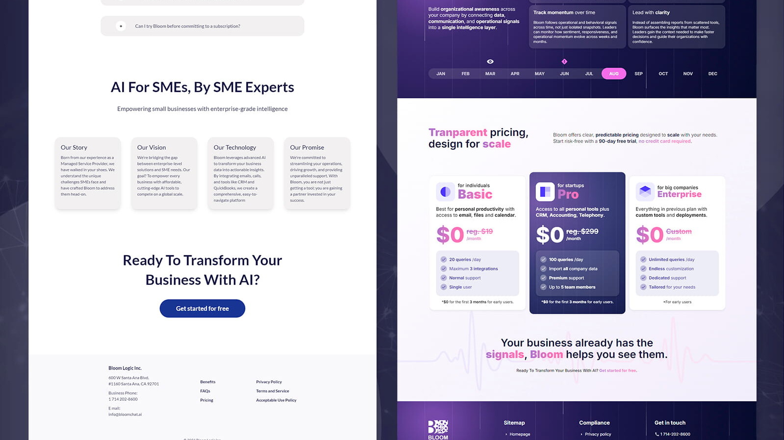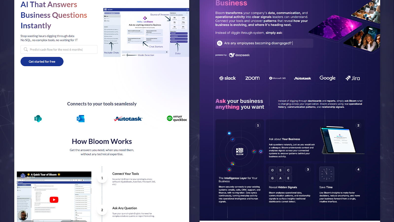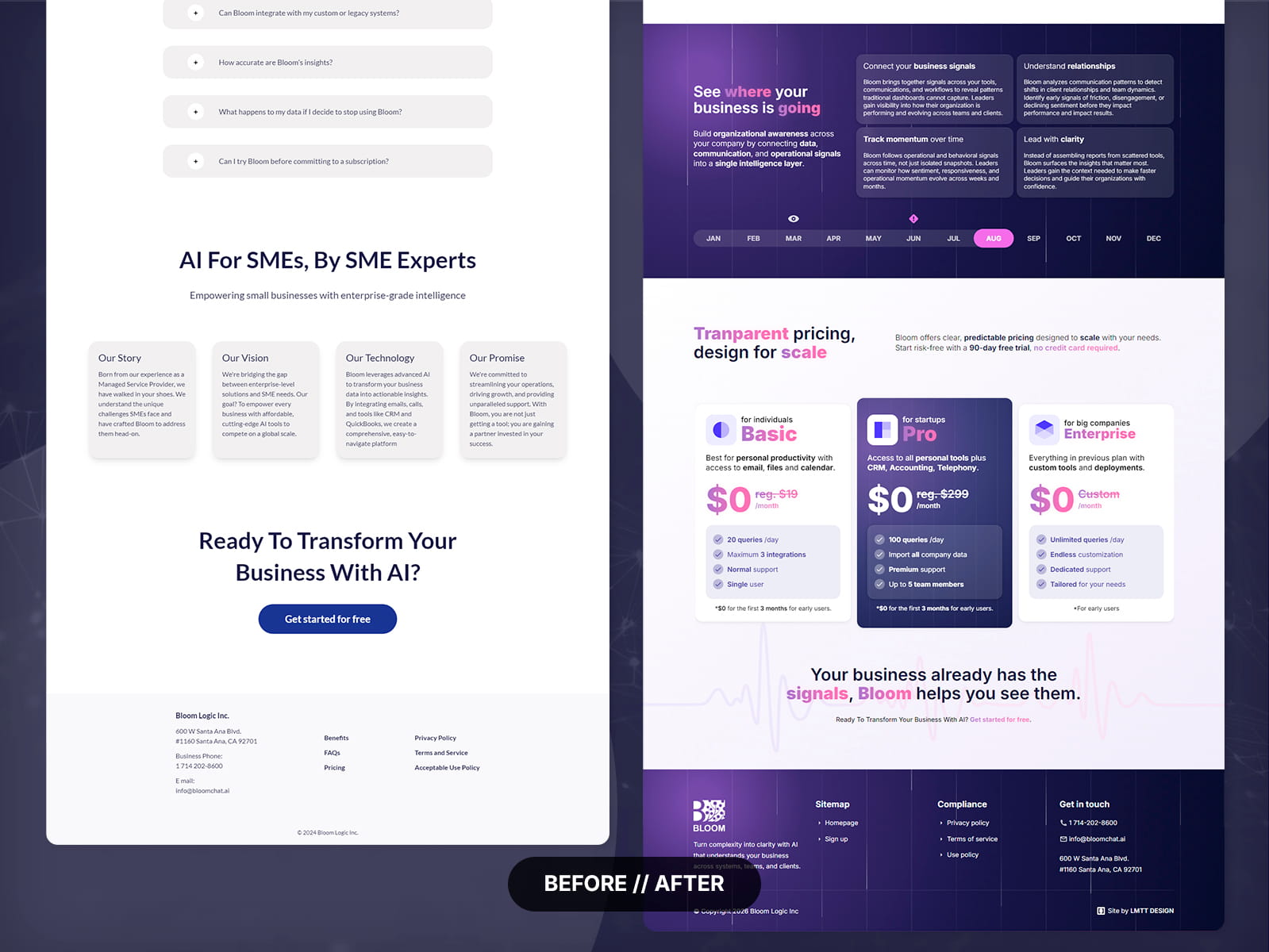 A Bloom Chat AI é uma plataforma de inteligência artificial criada para transformar conversas, interações com clientes e dados operacionais em insights acionáveis para empresas. O desafio do projeto era comunicar um produto complexo de forma clara e intuitiva, sem abrir mão de uma apresentação premium e altamente visual. O site precisava transmitir inovação, sofisticação e confiança, combinando storytelling, design SaaS moderno e uma experiência interativa que reforçasse o posicionamento da marca como “The Intelligence Layer for Your Business”.