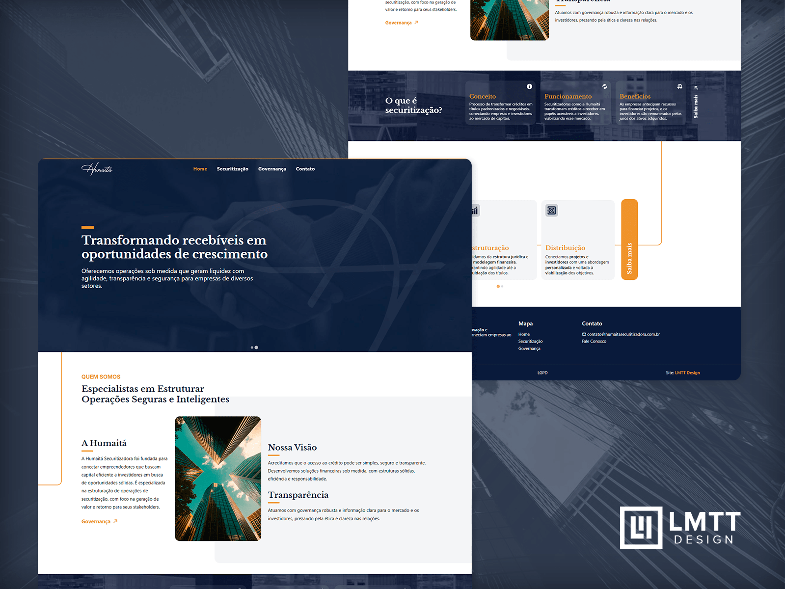 A LMTT desenvolveu um portal institucional completo, com foco em transparência, usabilidade e performance. O site apresenta um layout limpo e responsivo, com seções organizadas para cada público, incluindo investidores, parceiros e empresas. Foram implementadas áreas específicas para documentos de governança, processos de securitização, canais de contato e conteúdos educativos, tudo com carregamento rápido e navegação intuitiva. O resultado é uma plataforma sólida, alinhada aos valores da Humaitá e à exigência do setor financeiro.