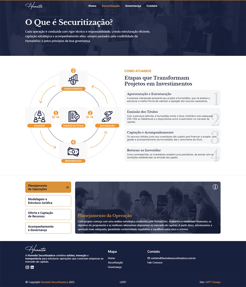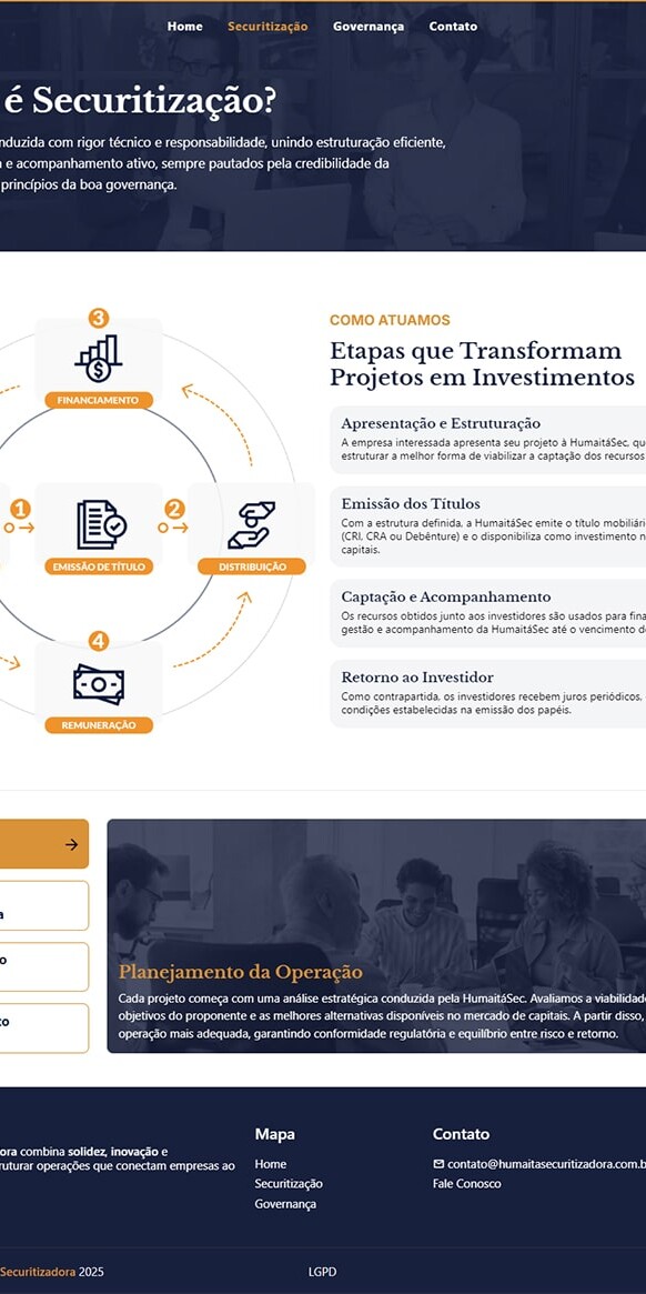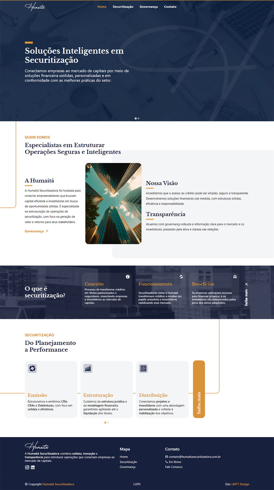 A Humaitá Securitizadora atua com seriedade e excelência na estruturação de operações financeiras no mercado de capitais. Com o compromisso de reforçar sua credibilidade institucional e facilitar o acesso de empresas e investidores às informações, surgiu a necessidade de um site claro, moderno e bem estruturado.