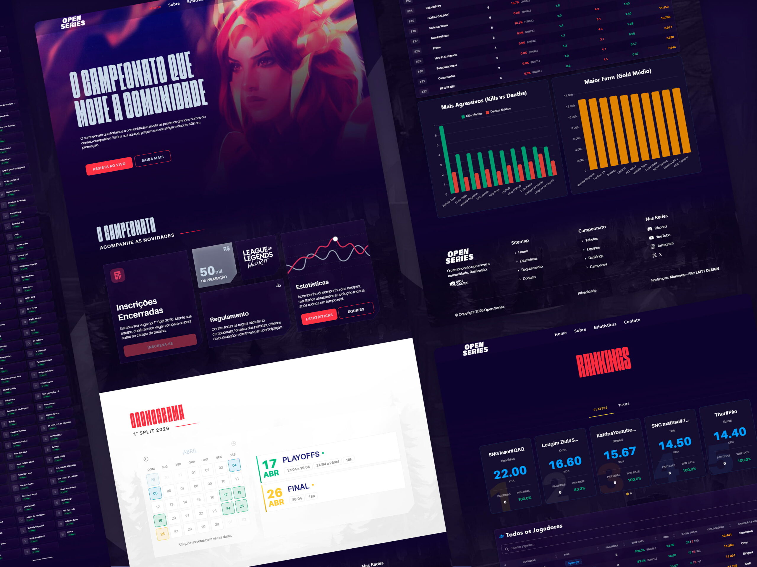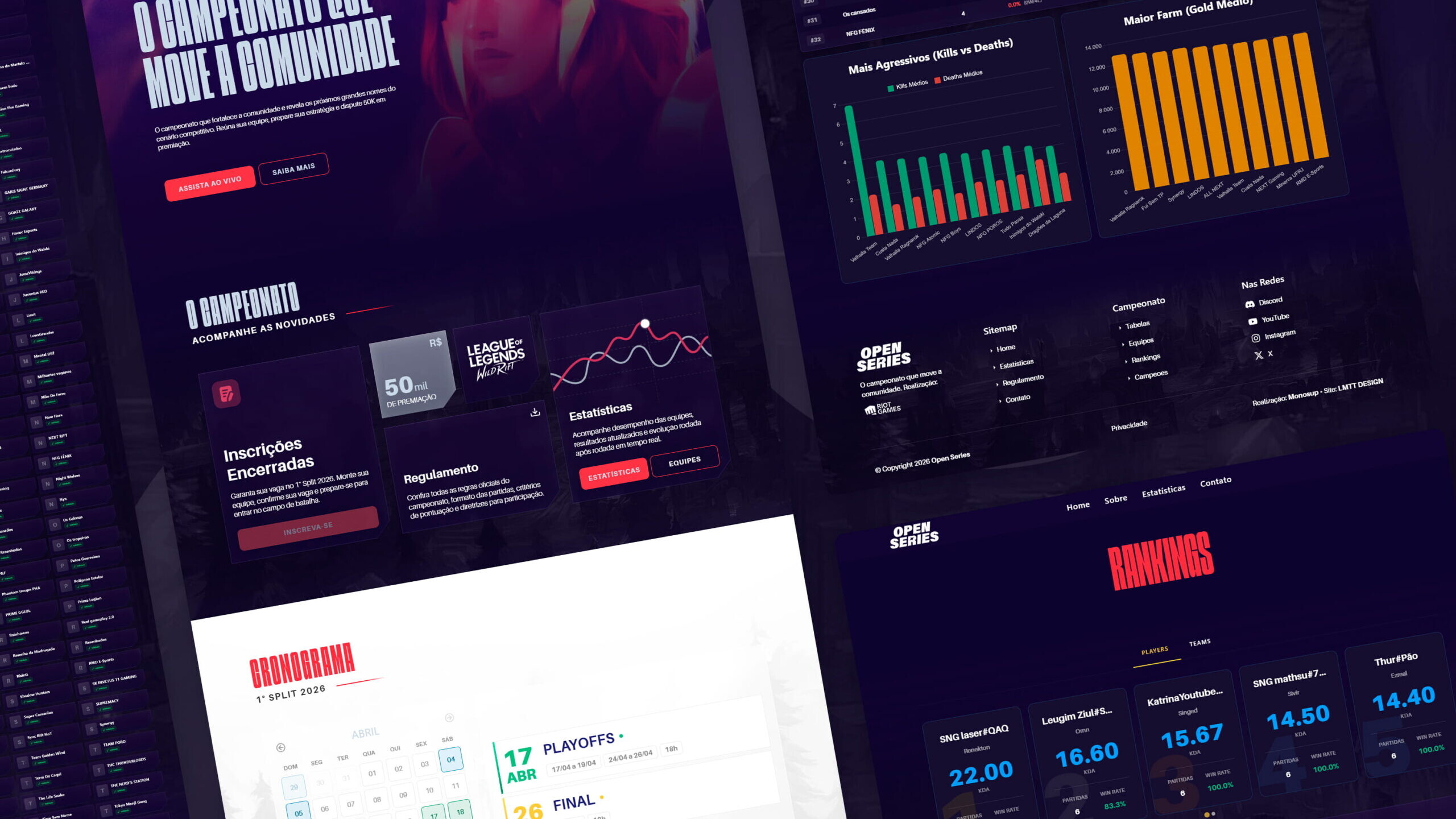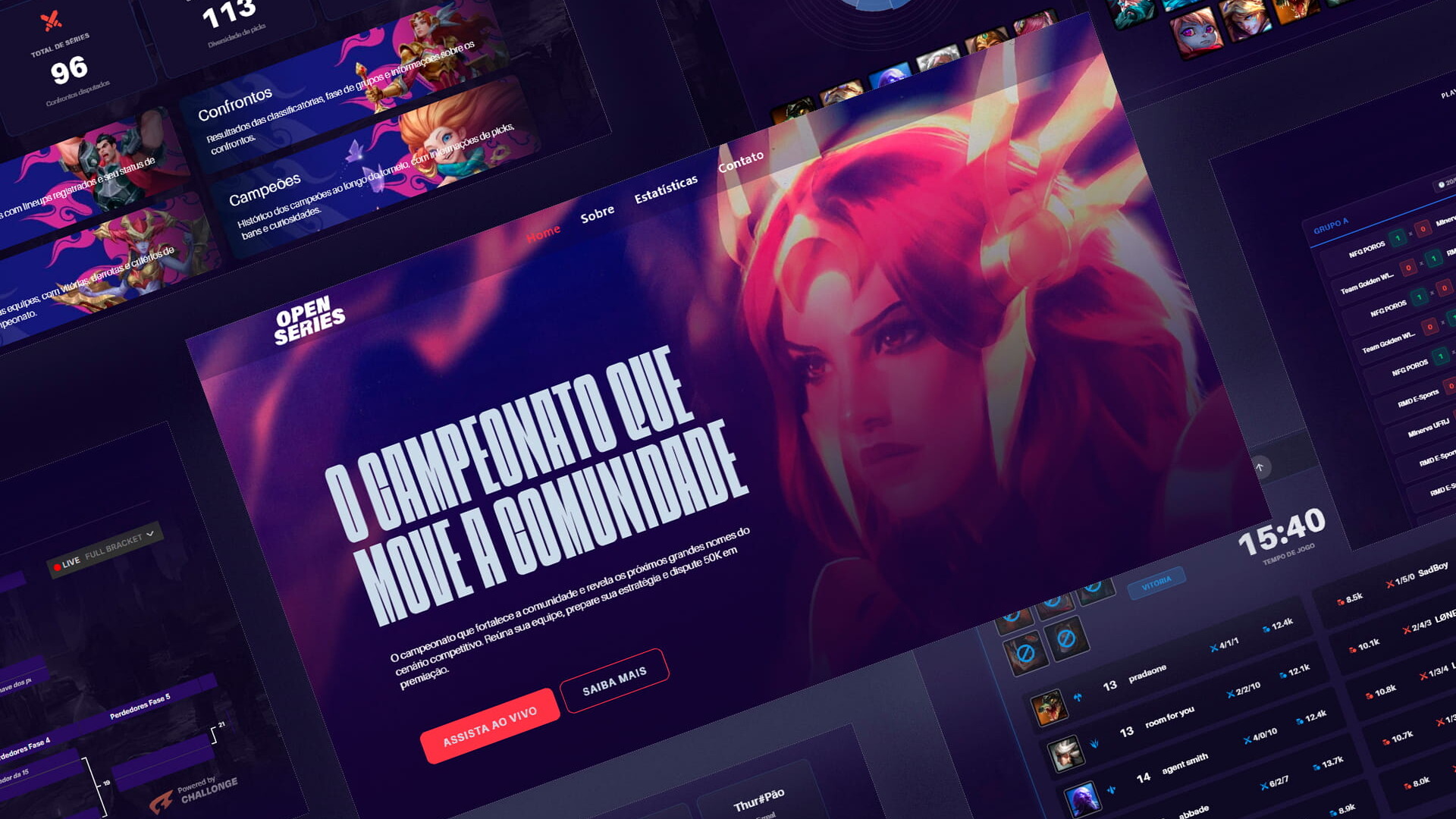 A Open Series é a plataforma oficial de torneios de Riot Games para League of Legends: Wild Rift, criada para fortalecer a comunidade competitiva e revelar os próximos grandes talentos do cenário. O projeto precisava suportar uma grande quantidade de dados em tempo real, incluindo calendário de partidas, rankings, estatísticas e resultados, sem comprometer a performance ou a experiência do usuário. Além disso, a plataforma deveria refletir o padrão visual e competitivo do ecossistema da Riot, oferecendo uma navegação moderna, imersiva e intuitiva para jogadores, fãs e organizadores.
