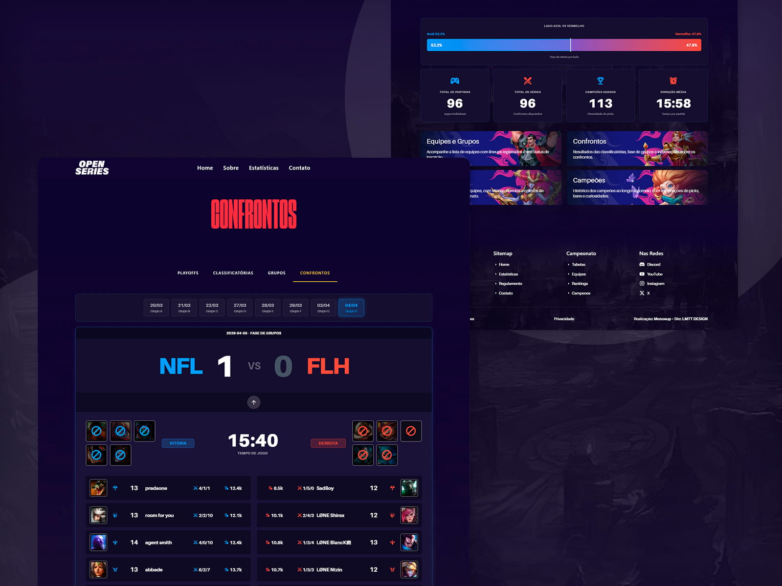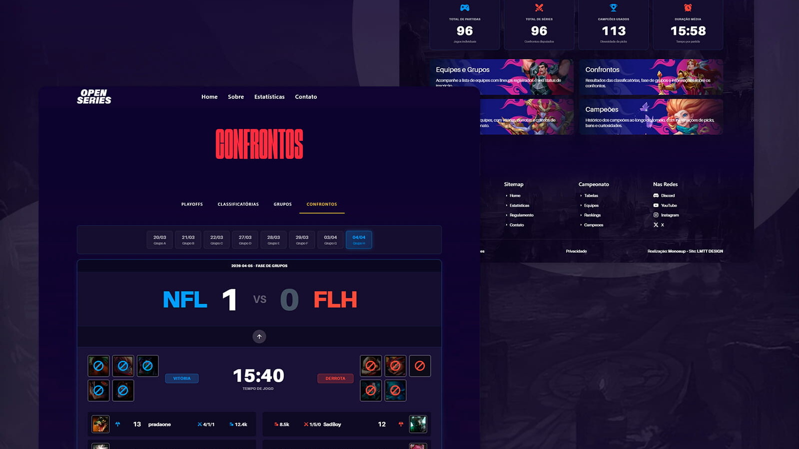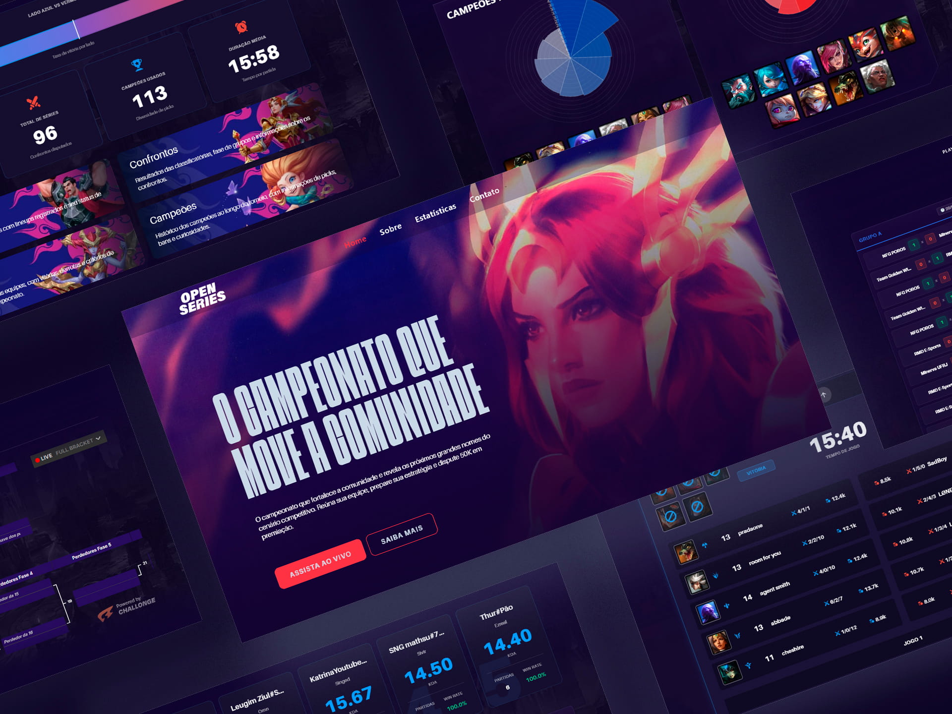 A Open Series é a plataforma oficial de torneios de Riot Games para League of Legends: Wild Rift, criada para fortalecer a comunidade competitiva e revelar os próximos grandes talentos do cenário. O projeto precisava suportar uma grande quantidade de dados em tempo real, incluindo calendário de partidas, rankings, estatísticas e resultados, sem comprometer a performance ou a experiência do usuário. Além disso, a plataforma deveria refletir o padrão visual e competitivo do ecossistema da Riot, oferecendo uma navegação moderna, imersiva e intuitiva para jogadores, fãs e organizadores.