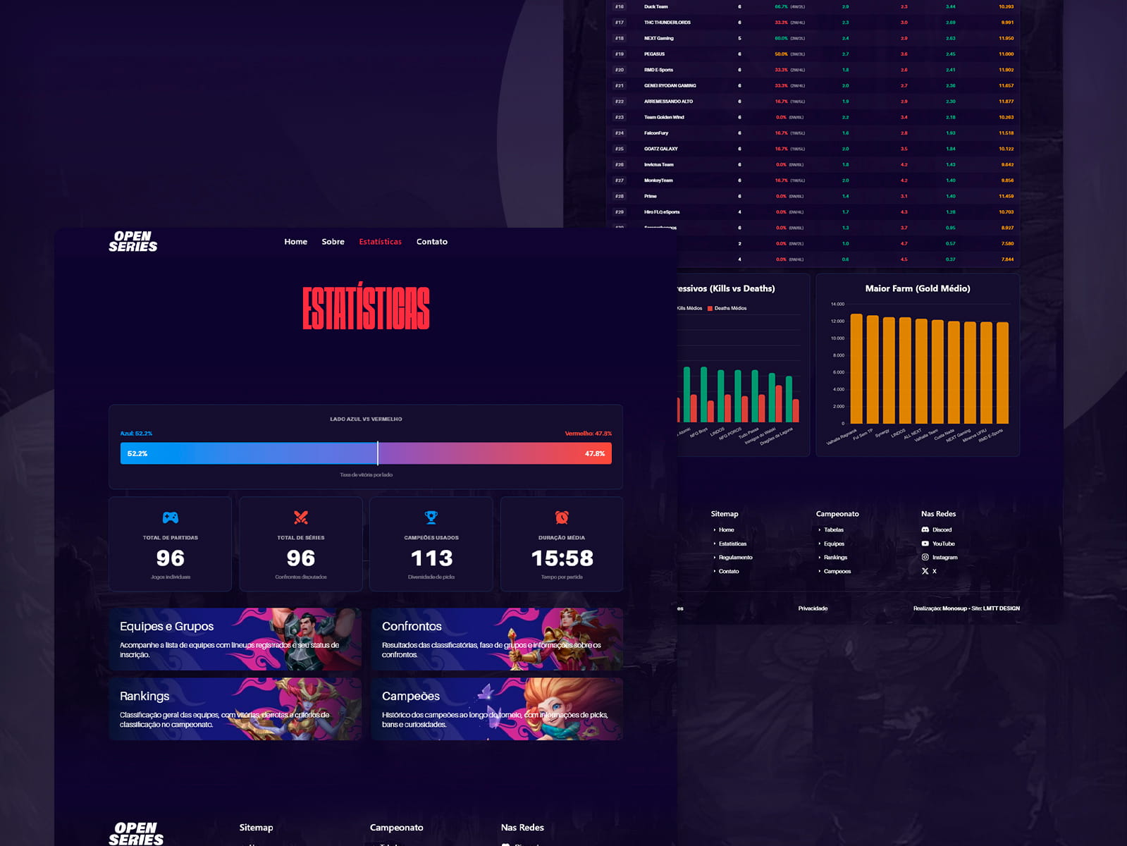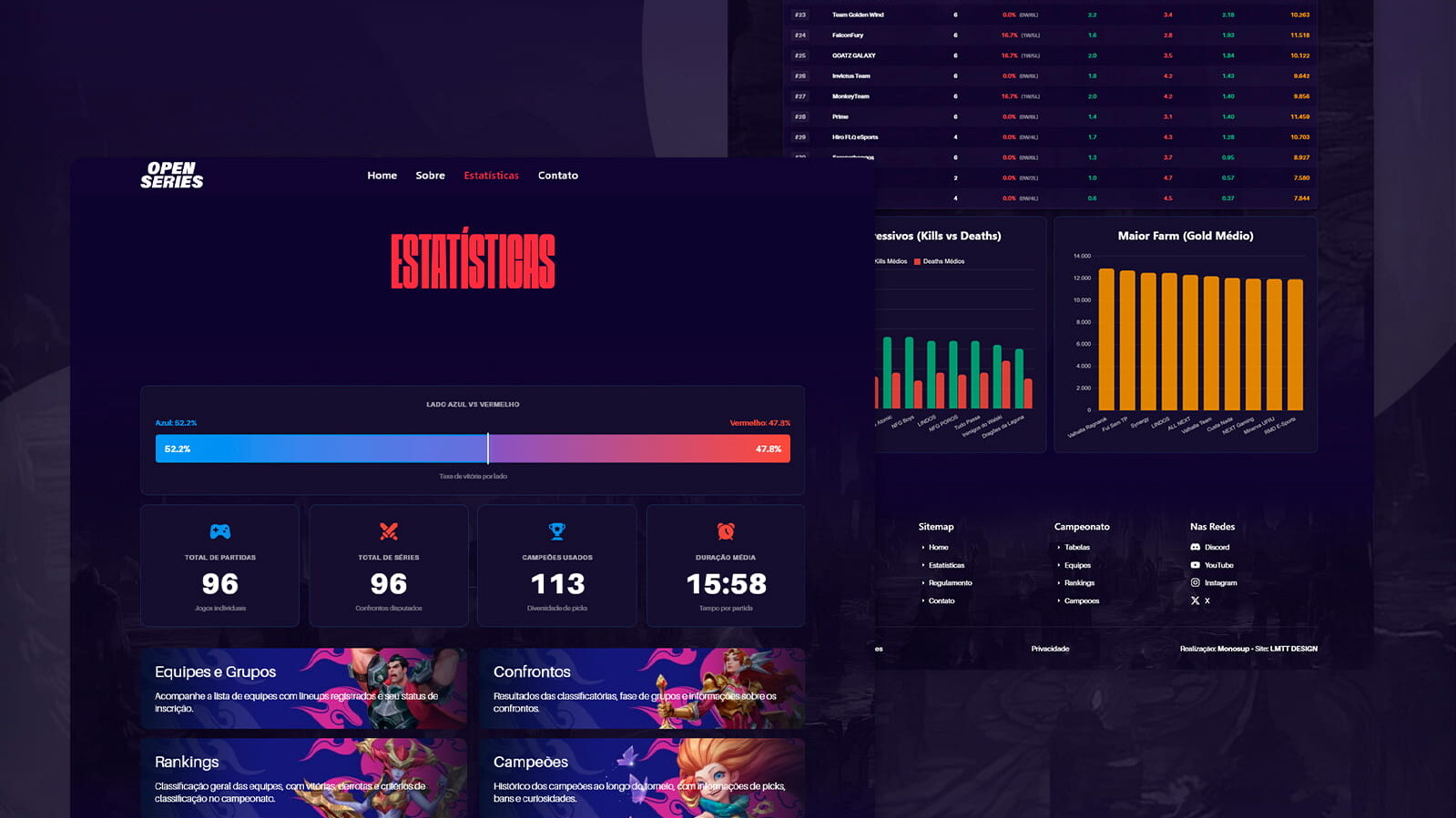 A LMTT desenvolveu uma plataforma completa de torneios, com foco em performance, atualização em tempo real e alto volume de dados competitivos. O site conta com calendário dinâmico de partidas, scoreboards ao vivo, histórico de confrontos, rankings automáticos e uma central avançada de estatísticas para equipes, jogadores e campeões. Também foram implementados gráficos animados, tabelas interativas e integração com API externa, permitindo que resultados, classificações e métricas sejam atualizados automaticamente sem intervenção manual.