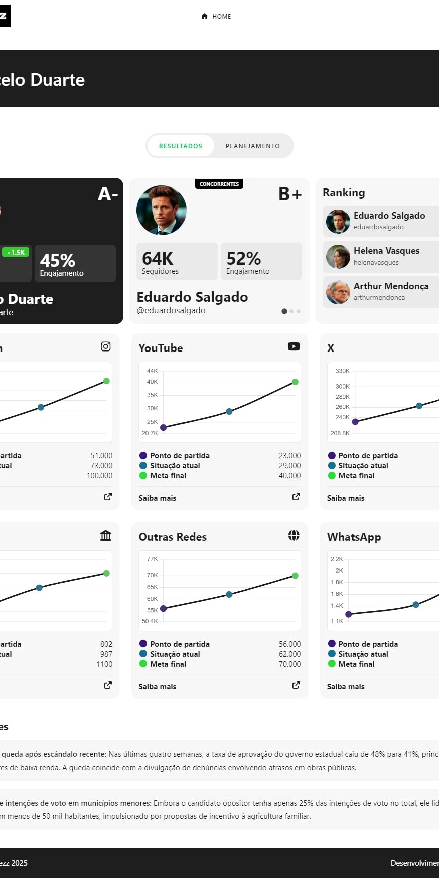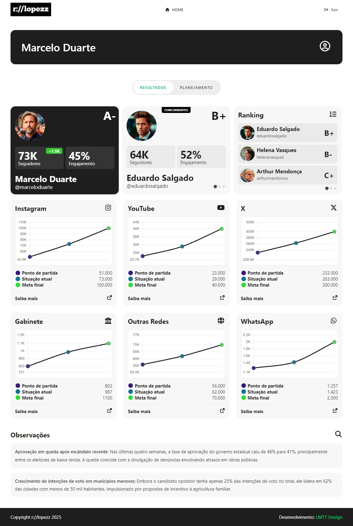 A LMTT desenvolveu uma plataforma completa, com dashboard interativa e painel de controle personalizado, que permite o acompanhamento em tempo real de métricas e resultados de campanha. O sistema possibilita cadastrar múltiplos candidatos, incluir dados como foto, engajamento, números e progresso em redes sociais — tudo exibido de forma visual e intuitiva, com gráficos dinâmicos e relatórios automáticos. Além disso, o backend inclui ferramentas de planejamento mensal e análise de performance, funcionando como um verdadeiro ambiente de analytics político. O resultado é uma solução digital robusta, que une tecnologia, usabilidade e inteligência de dados para fortalecer a gestão estratégica das campanhas.